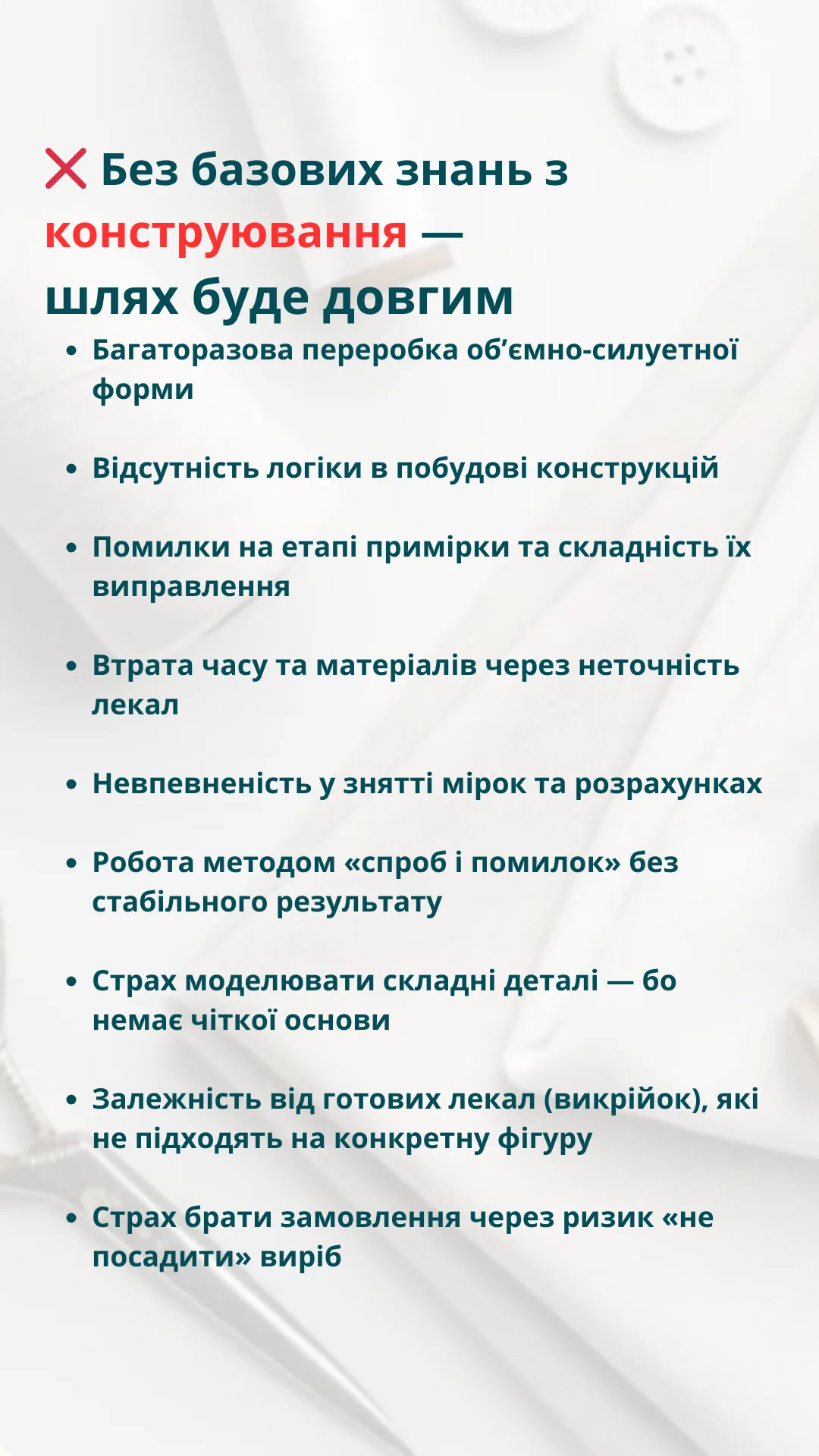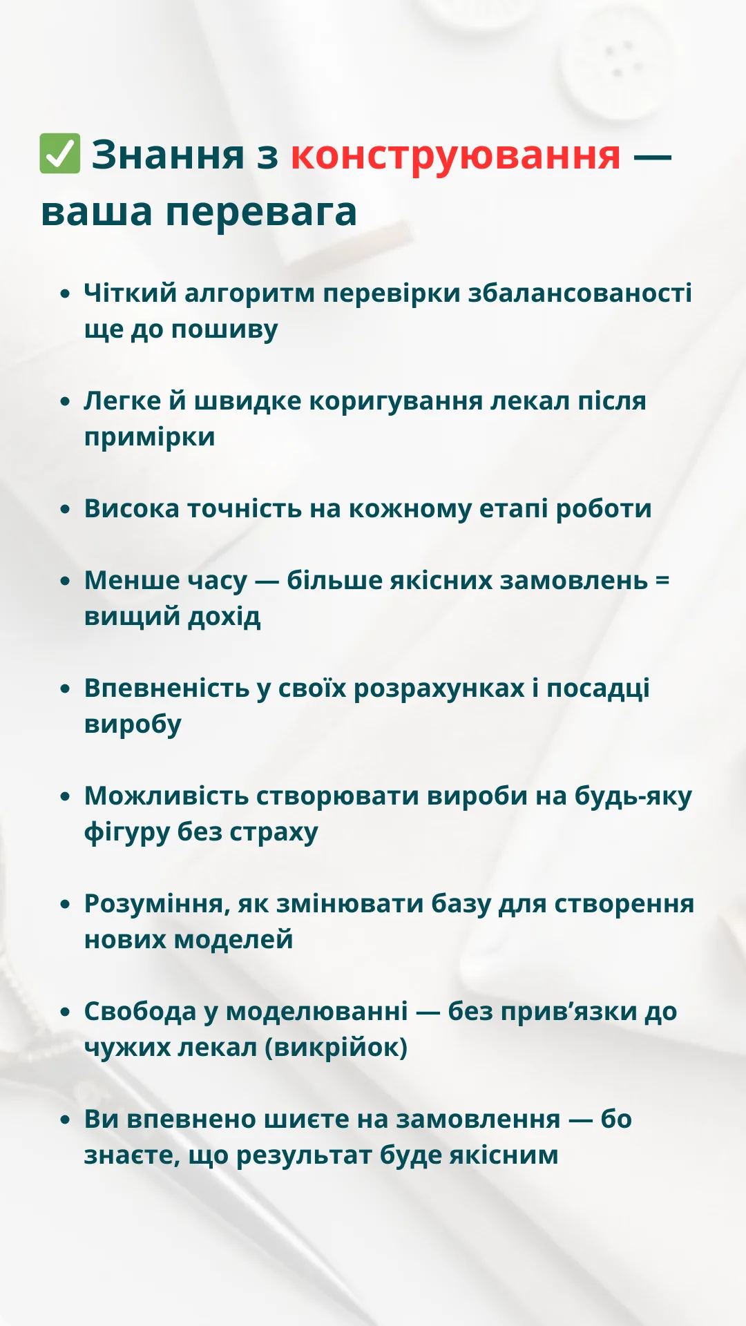 - Зможете створювати конструкції, які точно сідають на клієнта з першої примірки.