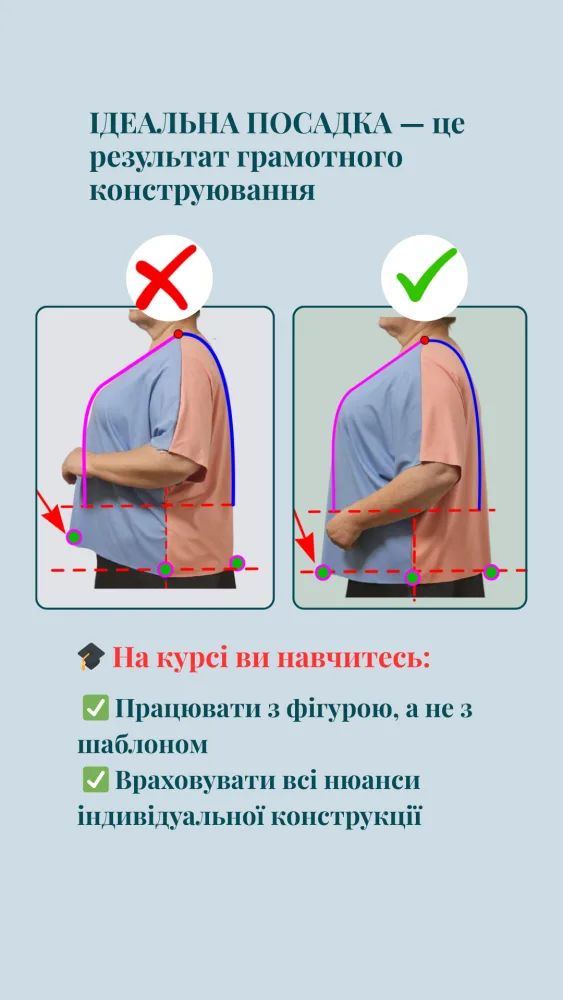 Ви зрозумієте, як особливості фігури впливають на посадку, і навчитеся будувати викрійки (лекала) з урахуванням балансу та індивідуальних мірок (розмірних ознак).