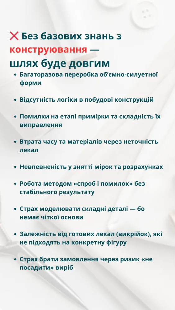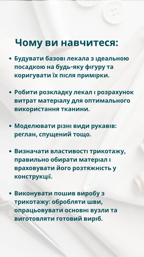 Ви навчитеся будувати і моделювати лекала (викрійки) самостійно — і зможете шити будь-який одяг під індивідуальні запити клієнтів чи для себе.